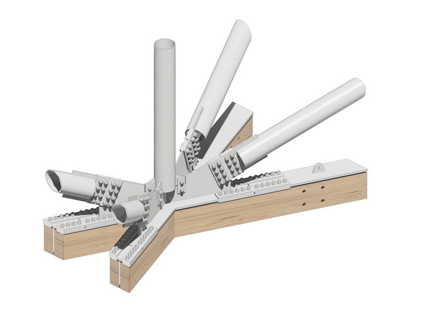 下弦材にはBT形鋼を用い、ウェブの両面から集成材で挟み込んだ木・鋼ハイブリッド部材とした。それにより、圧縮耐力および軸剛性を向上させている。これは国立競技場の屋根架構を応用したものだ。