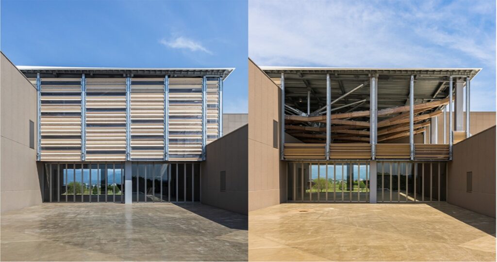 1つ目は「ヨリドマ」の木・鋼ハイブリッド部材だ。ヨリドマの陸屋根を支える架構は、メインアリーナ、サブアリーナと一体の構造となっている。トラス下弦材を斜交配置した木・鋼ハイブリッド部材で構成され、地震時の水平力を伝達する役割を果たす。