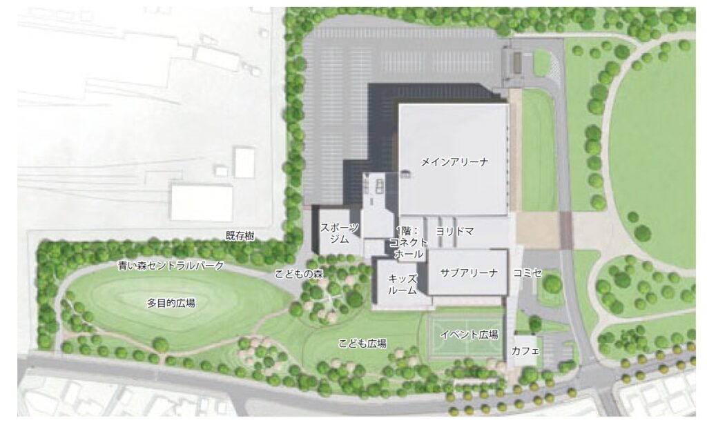 事業プロポーザルなので、大成建設は代表企業としてソフト面の提案にも初期から関わっている。正確に言うと、この事業はPark-PFIとDBOを併用したもので、公園内に青森市アリーナ(募集当時の名称)とPark-PFIによる収益施設(公募対象公園施設)を建設し、併せて園内に緑地や広場、駐車場などの特定公園施設を整備するという条件。完成後は公園全体の維持管理・運営を担う。応募した3グループの中から最優秀提案者に選ばれたのが、大成建設を代表とするグループだった。