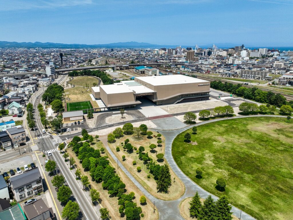 今回、リポートするのは青森駅から南東方向に約3kmほどの「青い森セントラルパーク」内に誕生した「カクヒログループスーパーアリーナ(青森市総合体育館)」である。2024年7月1日にオープンした。最大5000人収容のメインアリーナ(約2000㎡)とサブアリーナ(約920㎡)、県内最大級のキッズルーム(約760㎡)、多目的室(約560㎡)ほか、公園内の公募対象公園施設としてスポーツジム、カフェで構成される。