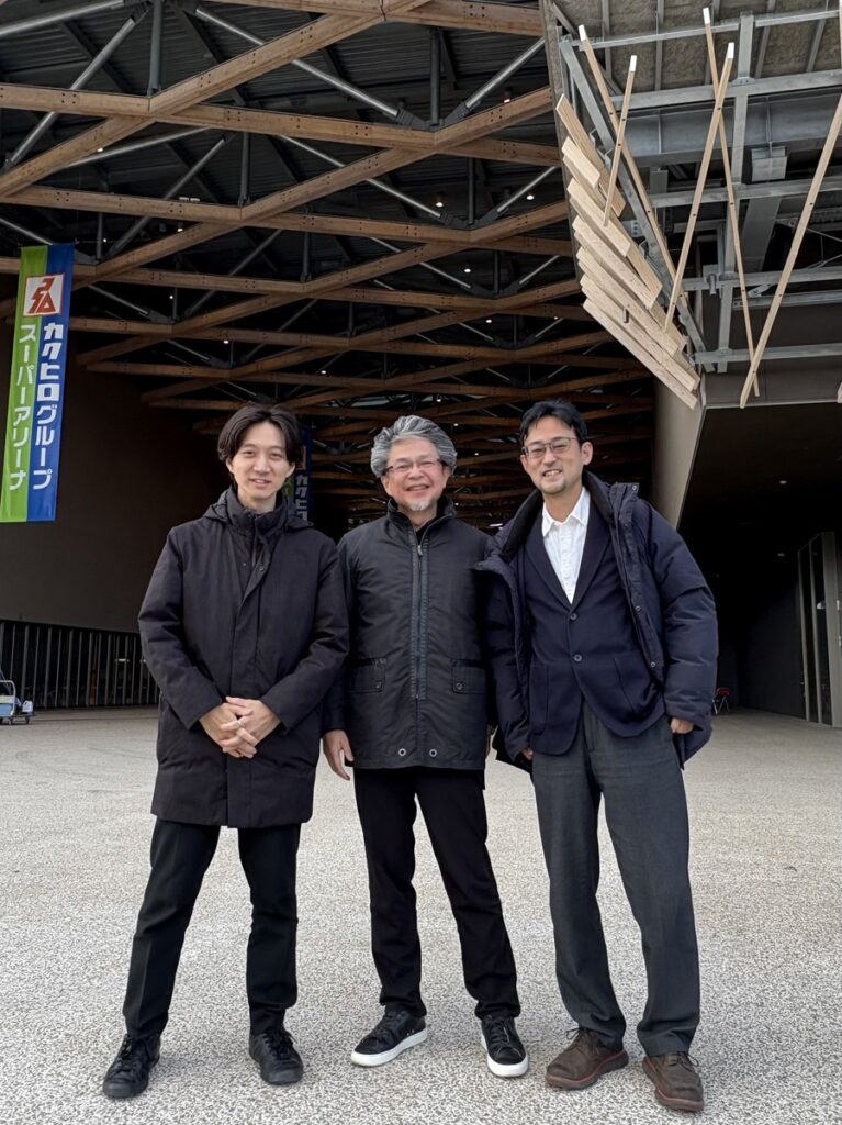 「大成建設と隈研吾氏」と聞くと、建築好きは2019年に竣工した「国立競技場」を思い浮かべるだろう。そのときの設計チームは、大成建設・梓設計・隈研吾建築都市設計事務所共同企業体だった。実は、このカクヒログループスーパーアリーナを担当した川野氏と堀川氏は国立競技場の設計にも参加していた。そのプロセスを通して意気投合していた大成建設と隈事務所のメンバーが、同競技場の竣工後ほどなく行われた公募型の事業プロポーザルで、「また一緒にやってみよう」ということになったという。そこに地元の気候や生活に詳しい川島隆太郎建築事務所が加わった。