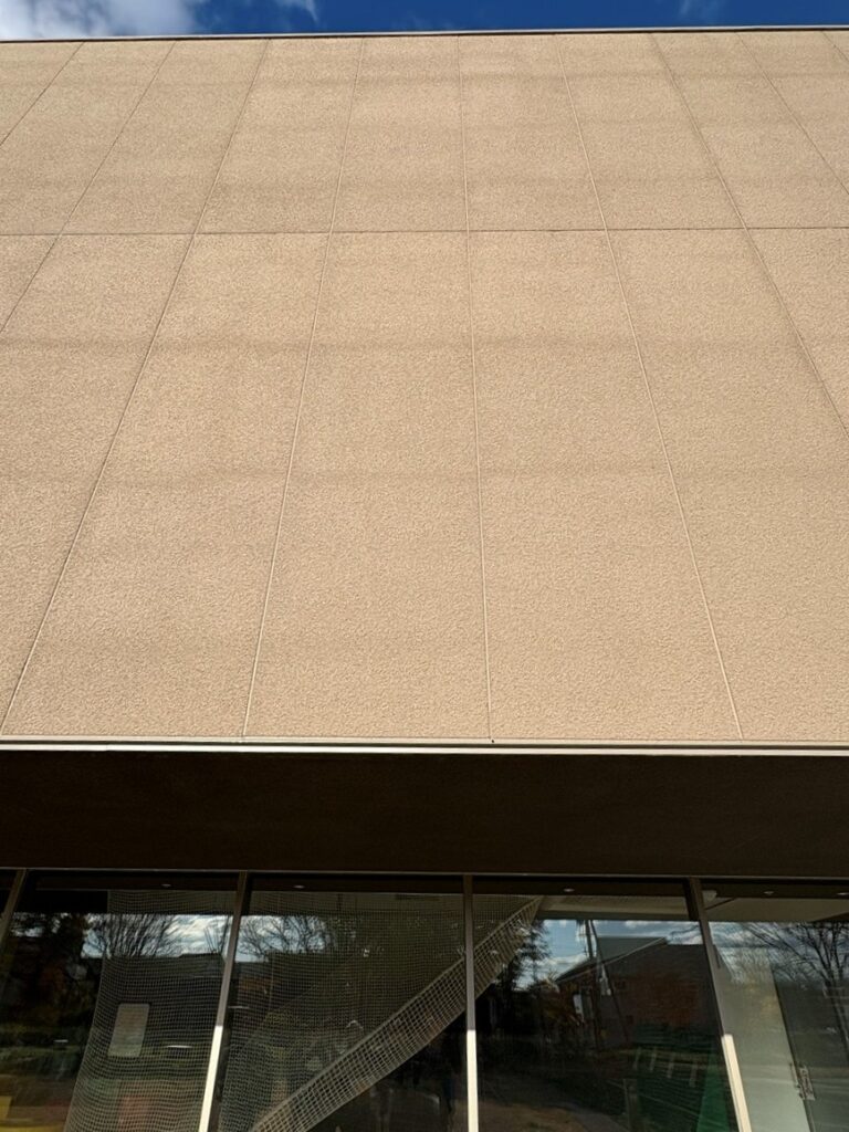 西側のこども広場から見る。写真中央にかっちょが見える。雪については、青森市は屋根の雪を落とすと建物への出入りができないくらいの積雪量となるため、無落雪工法の陸屋根とした。パラペットの立ち上がりは通常600mmのところを1500mmにして雪を溜める