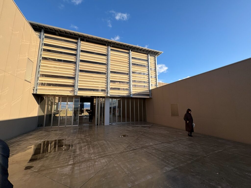 メインアリーナ(右)とサブアリーナ(左)の間にあるヨリドマを東から見る。ヨリドマは「よりどころ」と「土間」をあわせた造語