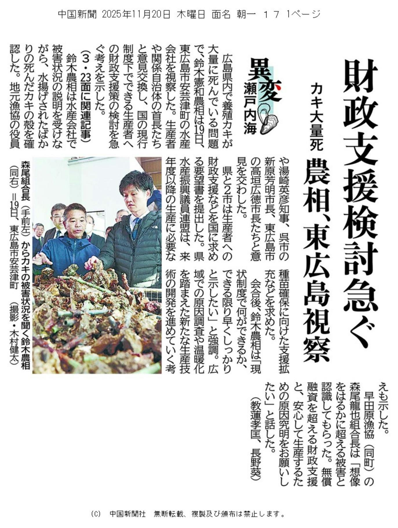 大量へい死について、日を追うごとに影響の範囲や規模が大きく変化しており、県内全体の情報収集・把握に努めると共に、鈴木農林水産大臣を始め、広島県選出の国会議員の方々、横田広島県知事も現場にて漁業者の現状を知って頂いております。