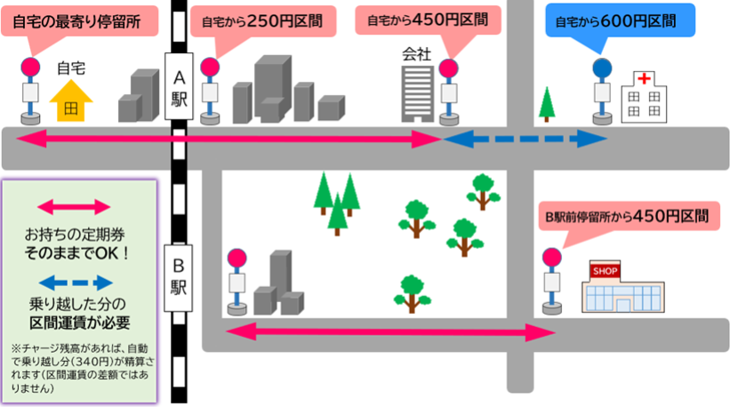 これまでは、特定の区間が指定された定期券が発行されたが、バスICOCA定期券では金額式になるため、区間の指定がなくなる。定期券の金額内の運賃であれば、区間を指定せずに乗降できるほか、乗り越した場合も、乗り越した区間分の運賃が自動で残高から引き落とされる。
