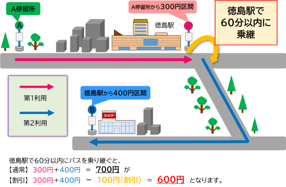 ICOCAなど交通系ICカードで、徳島駅前または橘営業所停留所で対象路線同士を乗り継ぐと、最大100円割引になる乗継割引サービスが導入される。対象路線同士を同一カードで60分以内に乗り継ぐ場合が対象で、たとえば徳島駅前では高速バスや空港リムジンバスを除くすべての路線が対象となる。