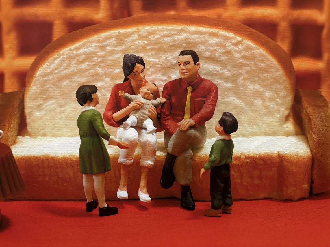 田中さんの作品は、ミニチュア人形たちの織り成す人間ドラマが秀逸。吹き出しを作るのは見る側だが、そのための材料をたくさん用意してくれている。