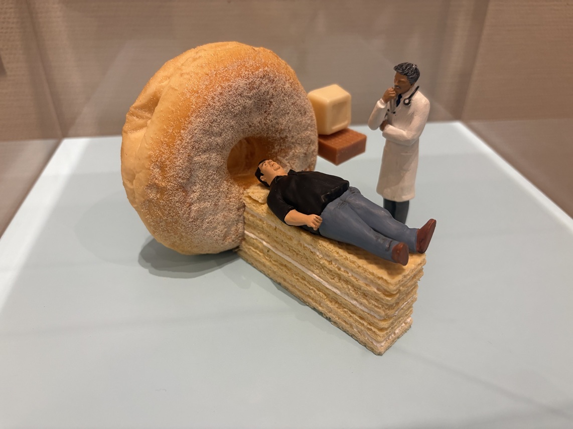 「当分は糖分を控tえてください」の、ドーナツのMRI装置に送りこまれようとしている横たわった男の顔を見てほしい。威厳を保とうとしているが、どうしても恐怖が表情に出てしまう。感情がダダ漏れした顔がなんともおかしい。