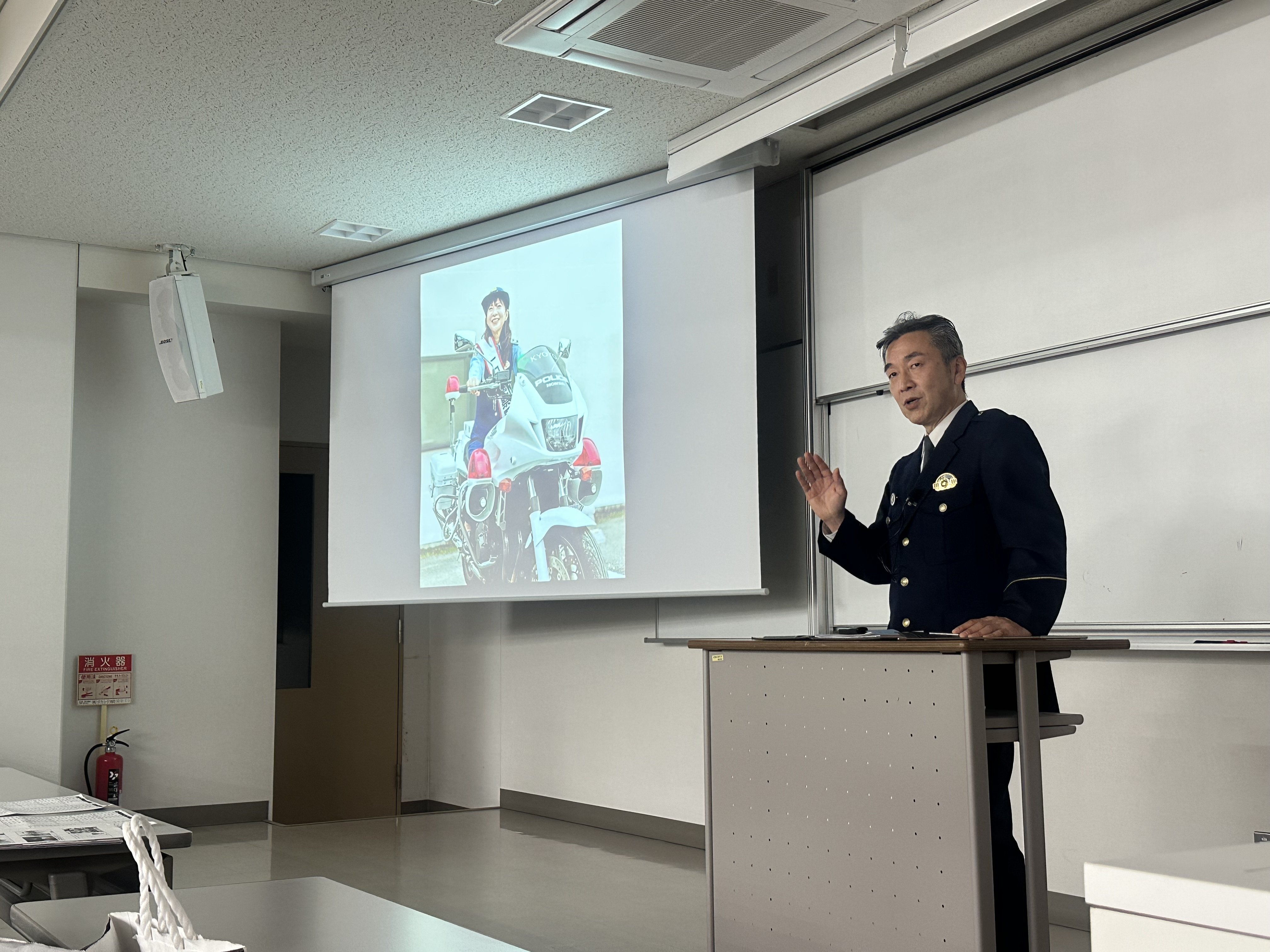 また北警察署 副署長の上田 幸則さんからは、自身の経験を踏まえ「社会情勢を正しく伝え訴えることも、警察官の重要な役割である」と服部ゼミの学びとも重ねつつ話をされました。さらに地域の方に本学をより身近に感じてもらうための交流イベント「サタデージャンボリー」への参加や、模擬面接の実施など、北警察署と本学および服部ゼミとの関わりについても説明されました。