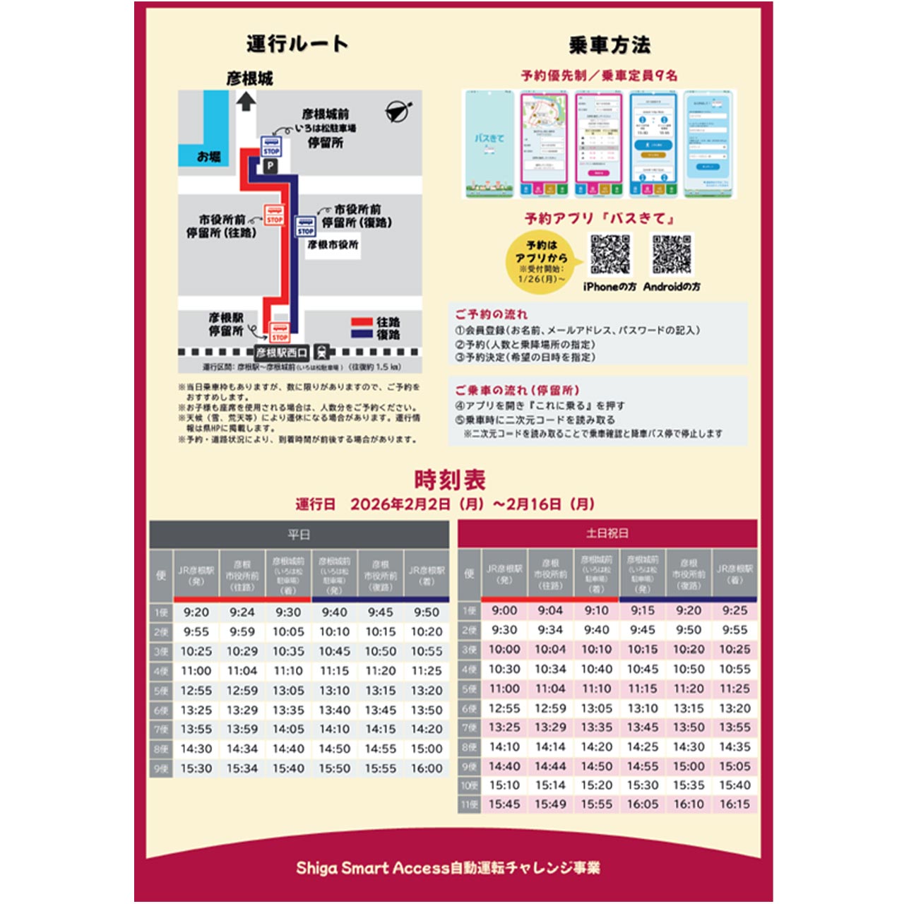 「彦根市彦根城ルート」において、以下のエリア・期間等で自動運転EVバスの実証運行を行う。
