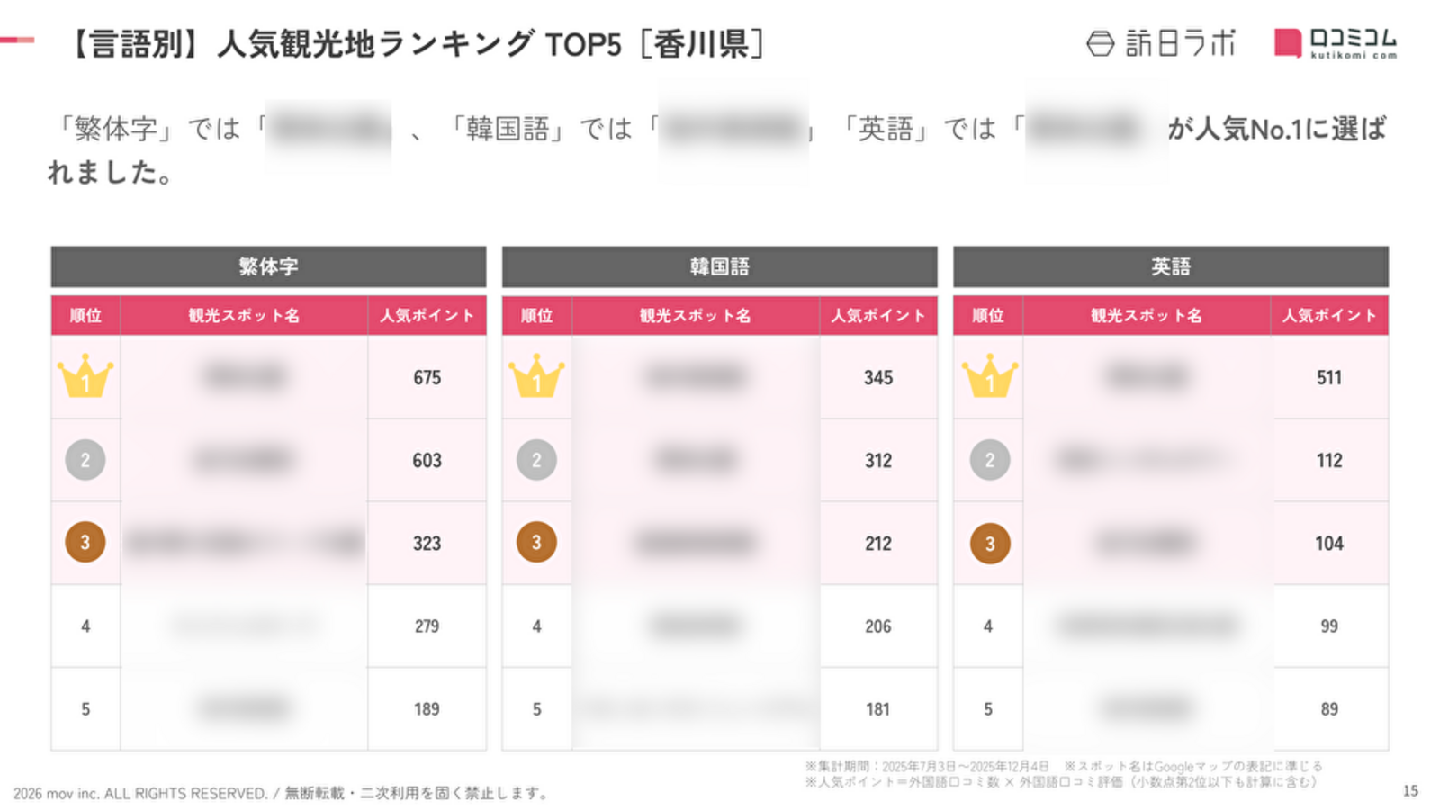 インバウンド人気観光地ランキング[香川県編]では、以下の内容が明らかになりました。