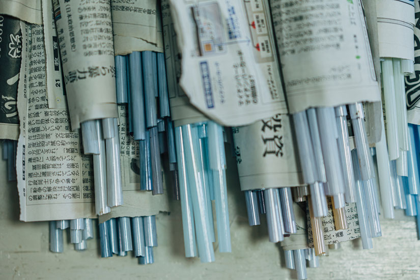 松尾さんの作品は「ぐい吞み」「酒盃(しゅはい)」「蓋物(ふたもの)」などバリエーションは様々。これらの作品で色の付いた線や花のような模様になって見えるものは、熱して棒状にしておいた色ガラスを透明なガラスの中に入れて溶かし合わせている。色ガラスは真っすぐなものや螺旋状のものなどがあり、透明なガラスと溶け合って浮かび上がるような模様が生まれる。