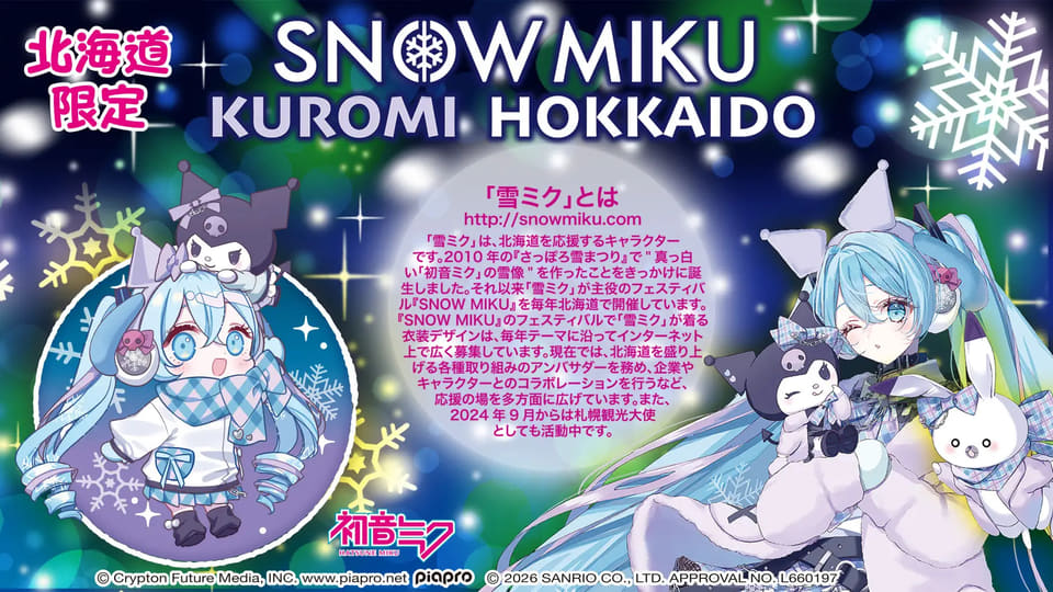 北海道を応援するキャラクターとして初音ミクをデザインした「雪ミク」と、サンリオのクロミがコラボレーションしたシリーズ。今回発売のグッズにはみすみ氏による描き下ろしイラストを使用し、昼(Day)と夜(Night)からなる2つの世界観を表現している。