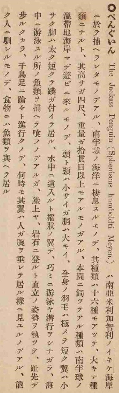 上野動物園案内(1919年) ペンギンに関する記述 – 自然×ペンギン コーナー ペンギンは現在全18種。絶滅危惧種に指定されている種もいます。南極のイメージが強いですが、南極以外にも生息することを知っていますか? 当館の豊富な資料でペンギンの生態を紹介します。