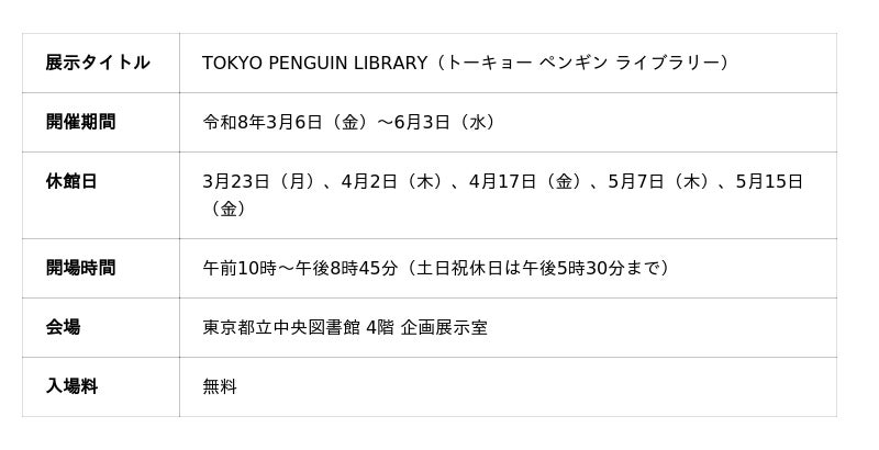 この記念すべきアニバーサリーを祝し、**東京都立中央図書館(広尾)では、ペンギンの魅力を歴史・生態・文化のあらゆる角度から紐解く企画展示「TOKYO PENGUIN LIBRARY」**を開催しています。