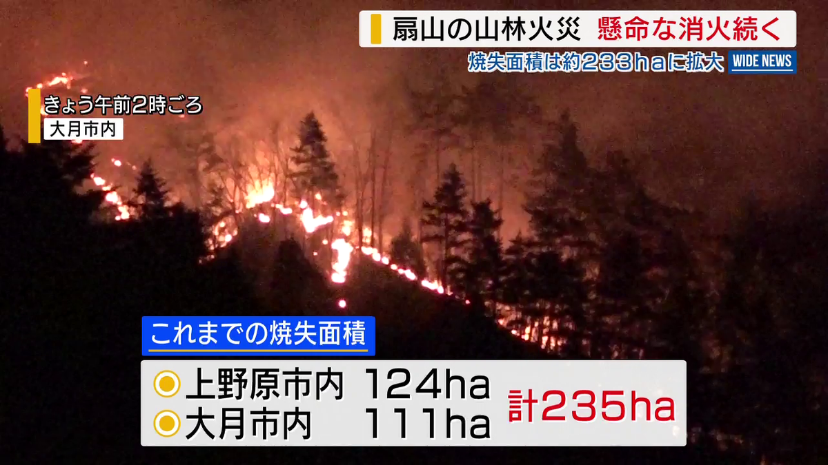 火災はこれまでに上野原市内で124ヘクタール、大月市内で109ヘクタールの計233ヘクタールを焼失した一方、大月市山谷地区の民家に迫っていた火はいったん、鎮圧状態となりました。