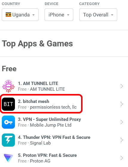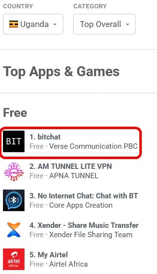 スマホアプリに関するデータを扱うAppFiguresのランキングによると、bitchatはウガンダのGoogle PlayとApp Storeでピーク時にそれぞれ1位を獲得したとのこと。