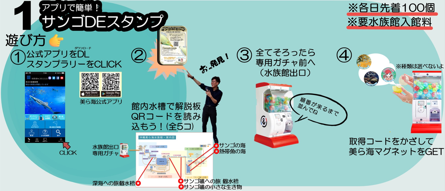 海洋博公園×沖縄美ら海水族館公式アプリの「デジタルスタンプラリー」機能を使用し、水族館内の水槽をめぐって 、サンゴやサンゴとともに生きる生物たちのデジタルスタンプを集めよう!