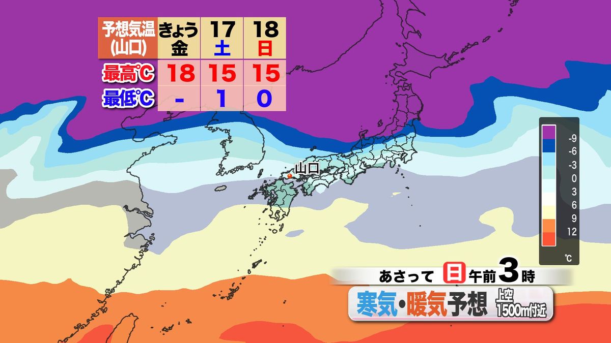 日中は日ざしと南風でハイペースで気温上昇。広く15度を超えて山口市内では18度まで上がるなど、全般に3月後半から4月前半頃の季節大幅先取りの暖かさ。昼間はダウンなどの防寒具は必要ありません。