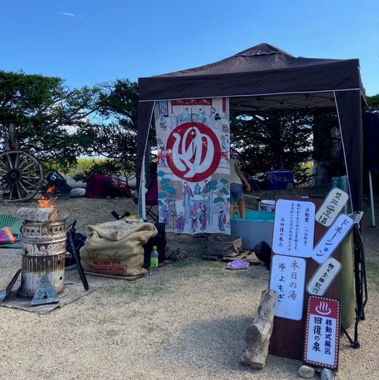 移動式風呂??回復の泉(足湯)「初めまして、風呂師のちあきと申します。焚き火の熱を利用して足湯を焚きます。ただの足湯と侮る事なかれ。火力調整で極上な温度に仕上げます。(不安な方は手を入れてみてください)お風呂に入ったかのように身体全身が暖まり回復する事ができます。まずは運転疲れに、途中踊り疲れに、眠る前に、お気軽に『回復の泉』にお越しいただき、足湯道楽をお楽しみください」