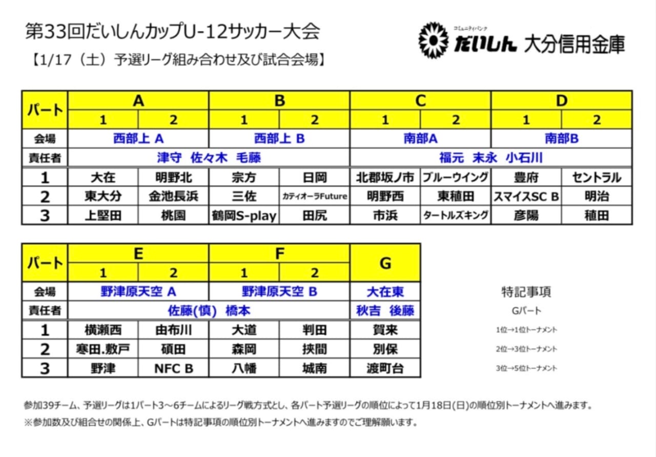 ・予選リーグは1パート3~6チームによるリーグ戦方式とし各パート予選リーグの順位によって1/18の決勝トーナメントへ進みます。