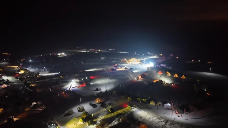 キャンプファイヤーが始まると、火の粉が夜空に舞い、極寒地用の分厚いダウンジャケットを着た観光客が手をつないで囲んだ。その近くで、ディスコダンスミュージックが流れ始めると、若者は氷上で楽し気に踊り始めた。