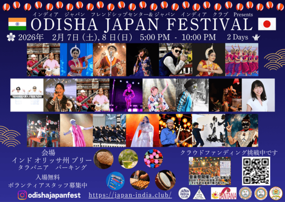 ODISHA JAPAN FESTIVAL 2026(OJF2026)を主催する特定非営利活動法人ジャパンインディアクラブ(所在地:埼玉県朝霞市、理事長:宮原 剛)は、2026年2月7日(土)、8日(日)の2日間、インド オディシャ州プリーにおいて、特設ステージでの日印両国の音楽や踊りのほか、子どもたちの未来・夢に繋がるブースを出展します。
