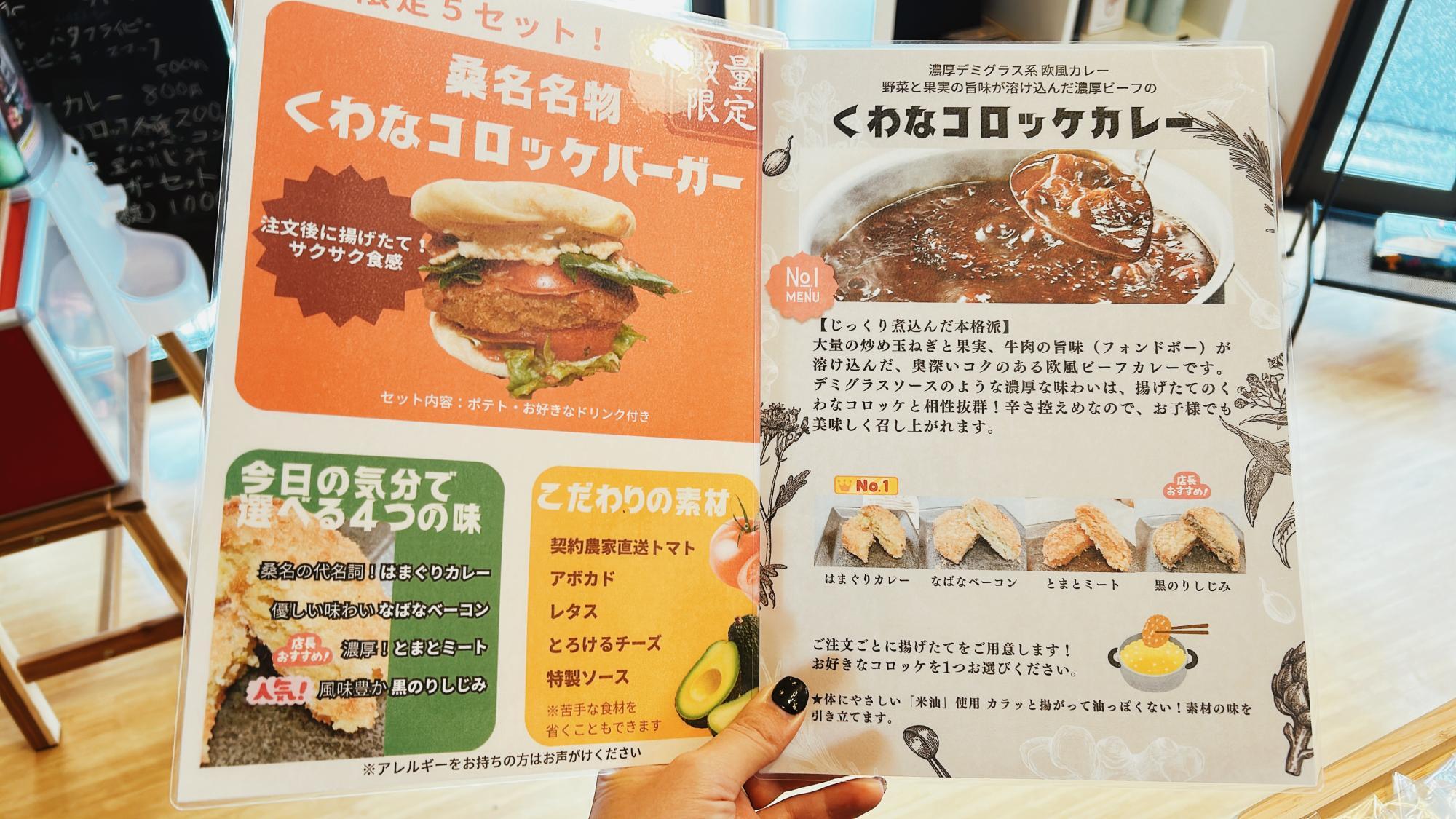 くわなコロッケバーガーやくわなコロッケカレーなど、食事メニューも用意されています。