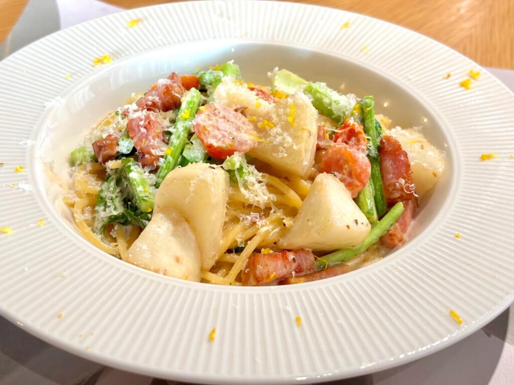 柚子の爽やかな香りと共に運ばれてきたのは、『カブと柚子のクリームパスタ』。お皿の縁に散りばめられたチーズの白と柚子の黄色が料理の華やかさをプラスしていました!