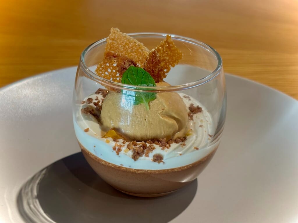 チョコプリンの甘さと、キャラメルアイスのほろ苦さ、生クリームとプリンの滑らかさとアーモンドのパリパリ感と、様々な味や食感を楽しむことができるデザートでした!