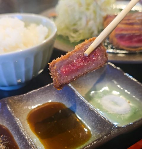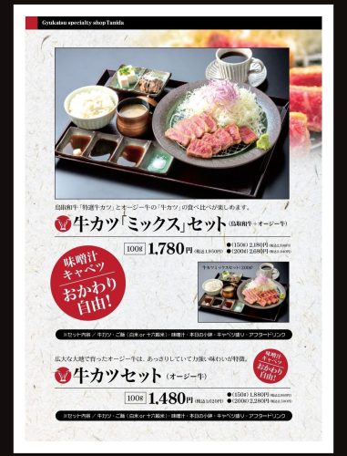 鳥取和牛「特選牛カツ」とオージー牛の「牛カツ」の食べ比べが楽しめるセットもあります。