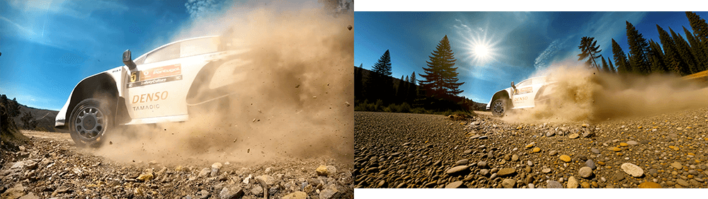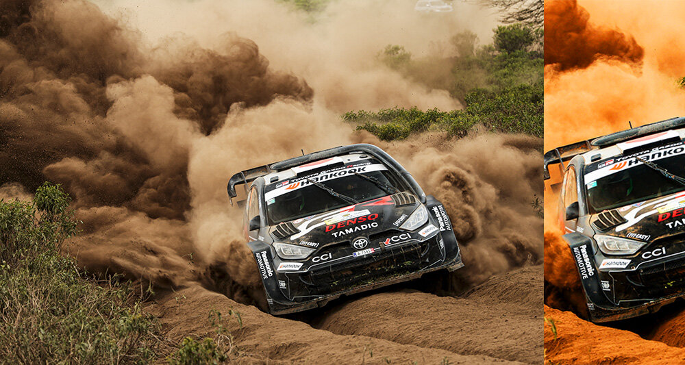 ▲ラリー写真の加工前と加工後。写真の一部をトリミングし、Photoshopでグレーディングを施した。「ラリーの走行美は、ライオンなどの動物に喩えられることが多いんです。そこで参考にしたのは、実際の動物の写真です。車両の正面だけでなく、さまざまな角度から見せる切り取り方にこだわりました」(CGデザイナー・大澤 岳氏)