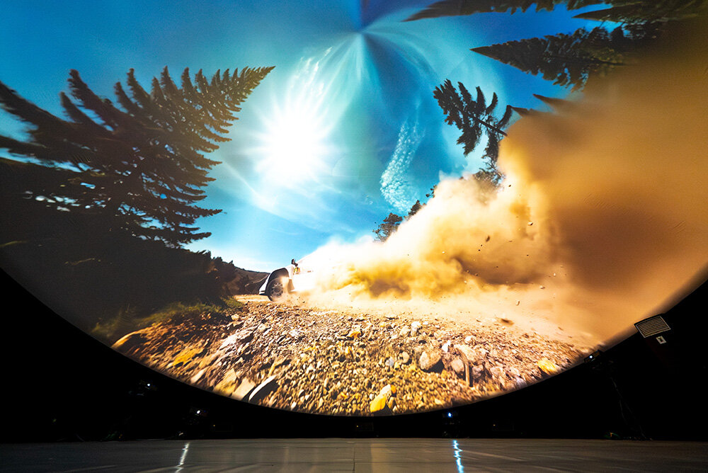 クリエイティブディレクターの引田祐樹氏は、ラリーの醍醐味は「車両と自然のインタラクション」にあると語る。走行によって巻き上がる土煙や砂、舗装されていない路面を駆け抜けるアクロバティックな挙動。それらをドーム空間でどのように体感させるのかが課題だった。そこで今回は、ラリー大会の映像や写真の実写素材をベースに、ドーム投影用の映像を制作する方針を採用。必要な箇所に3DCGを加えることで、ラリー競技の本質をエンハンスするアプローチが採られた。