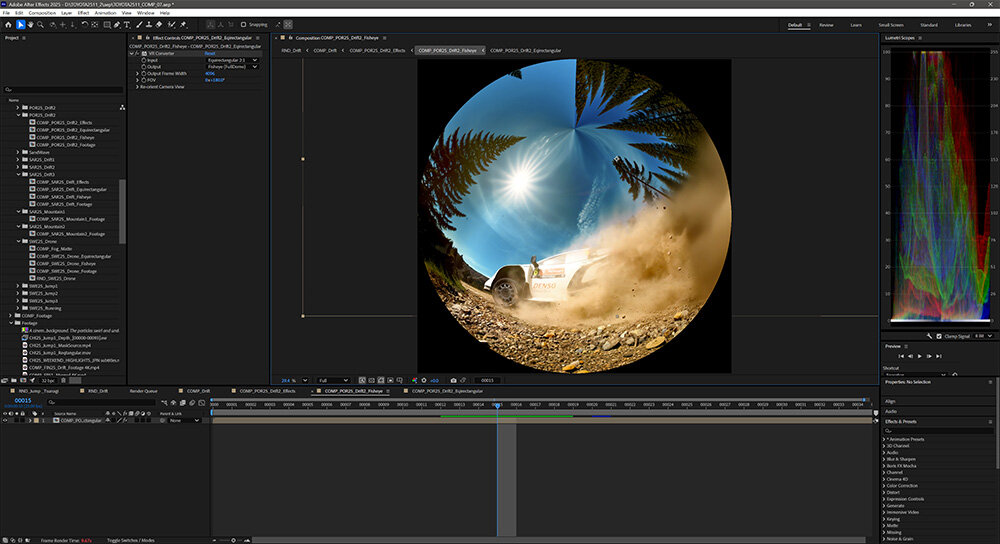 さらに、AIが出力した2:1の超広角の映像に手を加え、最終的にはAfter EffectsのVR Converterを用いて、ドーム投影用の1:1のフォーマットに変換する。「本来の正しいフィッシュアイ(魚眼)ではなく広角を丸めただけなのですが、こういった車体の歪みもラリーの『野性味』として受け取られるように演出しました」(エクスペリエンスデザイナー・吉田開登氏)