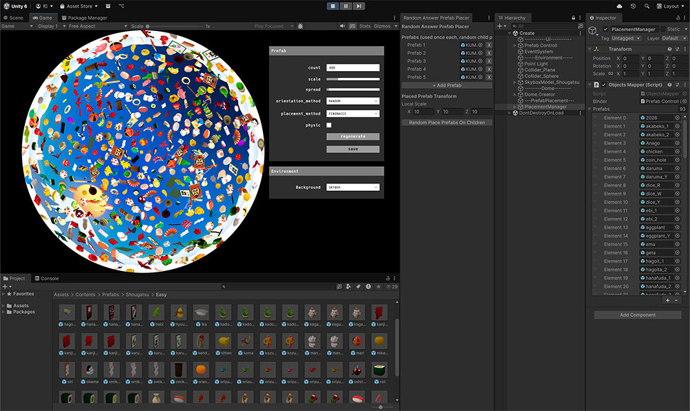 システムはUnityで制作。オブジェクトの個数/サイズ/向きなどを制御できる。ドーム投影用の映像へ変換した上で、NDI(Network Device Interface)出力にも対応し、会場での調節も可能だ。もし問題が難しすぎる場合は難度を下げ、逆に簡単すぎる場合は制限時間を短くするといった運用を想定している。ほかのコンテンツの尺に応じて、本パートの持ち時間を伸縮し、イベント全体のタイムテーブルを調整できる点も便利だという。