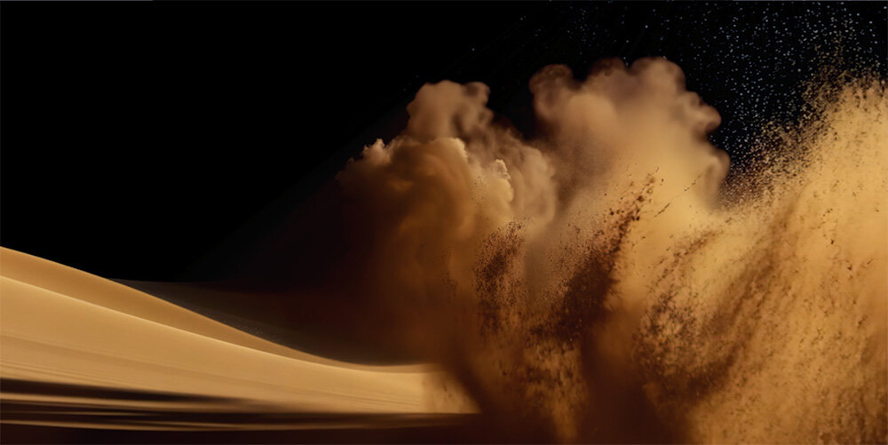 この特性を活かしたのが、砂埃のシーンだ。車両が巻き上げる土煙の広がりはAIが生成した背景素材で表現。観客に向かって飛んでくる砂利は、Unreal Engineでレンダリングした素材を合成し、VFXとしての迫力を吹かした。このように実写メインではありながら、ドーム映像らしい“飛び出す”演出を加えることで没入感を高めている。
