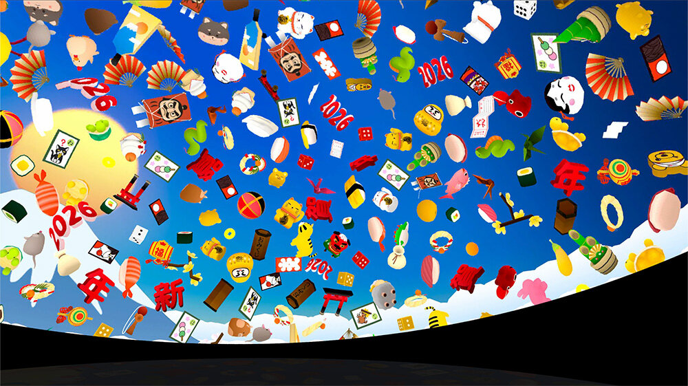 ギャラリーシーンでの技術的なチャレンジは、線や文字といったグラフィック表現の導入である。ドーム映像では投影面が曲面になるため、とくに文字が歪みやすく、視認性を保つのが難しい。本作では、2D的なモーショングラフィックスをドーム空間で破綻させずに展開する手法が求められた。