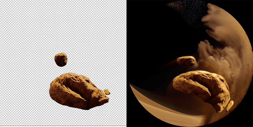 ▲左:Unreal Engineで作成した砂利素材、右:After Effectsによる合成結果