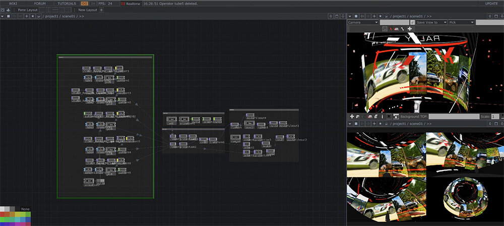 ▲TouchDesignerでの作業風景(上)とドームでの見え方をシミュレーションしたもの(下)。素材を分割して円柱状に変形し、同心円状にレイヤー配置することで、ドーム空間でも歪みの少ないグラフィック表現を実現できた