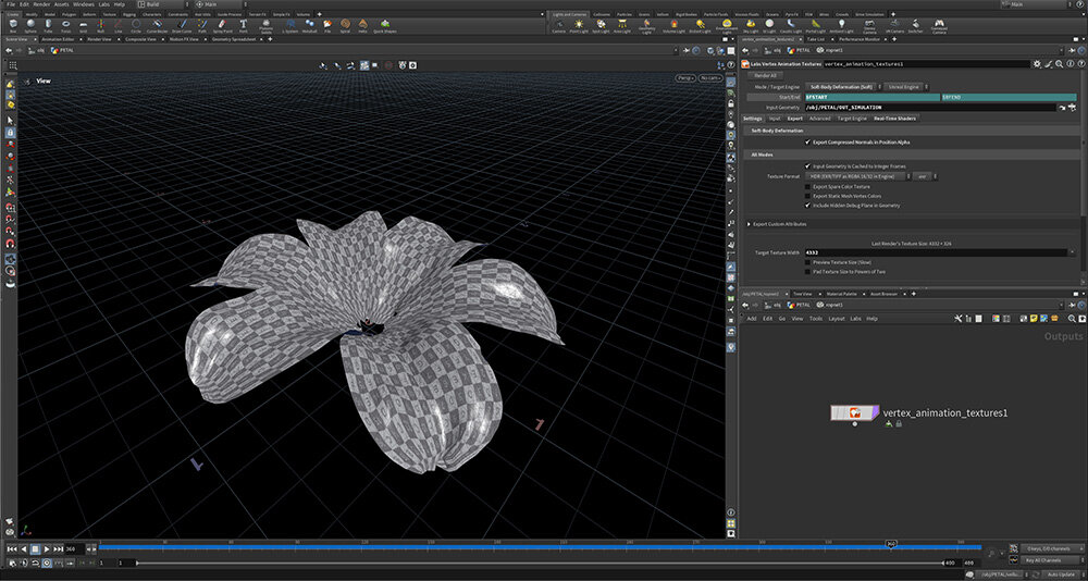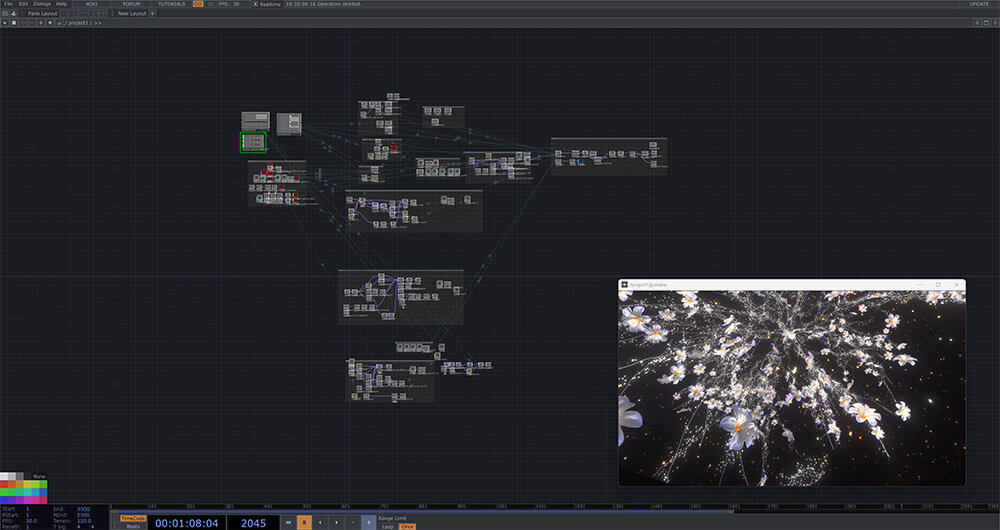 ▲HoudiniとTouchDesignerの作業風景。技術面のポイントは、HoudiniとTouchDesignerの連携にある。花びらや枝などのモデリングをHoudiniで行い、花の挙動はシミュレーションとして作成。その結果をVAT(Vertex Animation Texture)として書き出し、TouchDesignerに取り込んで大量に配置した