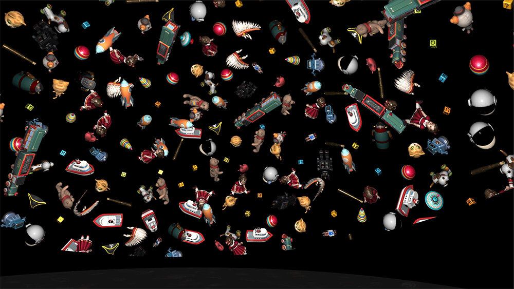 ▲「さがして!イマーシブ くま吉編」では、大量に配置されたオブジェクトから「くま吉」を見つけることが目的だ。検証の結果、オブジェクトをランダムに散らすと、「子供が怖がってしまいそう」という印象をもった。とくに暗い背景にリアルなライティングの物体を配置すると圧迫感が生まれやすい