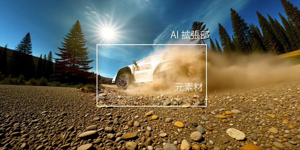 一方で課題も多かった。AI生成では、車体に貼られたロゴやスポンサー名を正確に再現しづらく、拡張後の解像度が最大1,280ピクセルに制限されるという問題も生じた。そこで、観客の視線が集中する車両部分のみ4Kのオリジナル素材に置き換え、周辺部は1,280ピクセルのまま使用。ドラマ性の高い演出を画面中央に集約させることで、画質の差が意識されにくい画づくりを実現した。