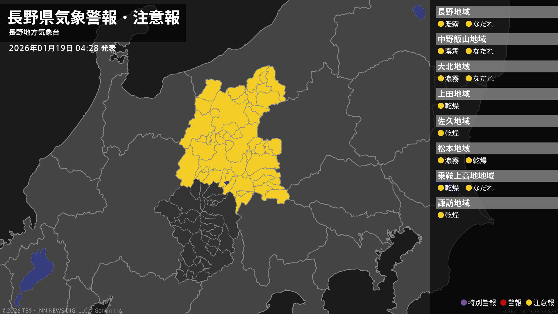 気象台は、午前4時28分に、なだれ注意報を長野市、乗鞍上高地、中野市、大町市、飯山市、白馬村、小谷村、高山村、山ノ内町、木島平村、野沢温泉村、信濃町、小川村、飯綱町、栄村に発表しました。