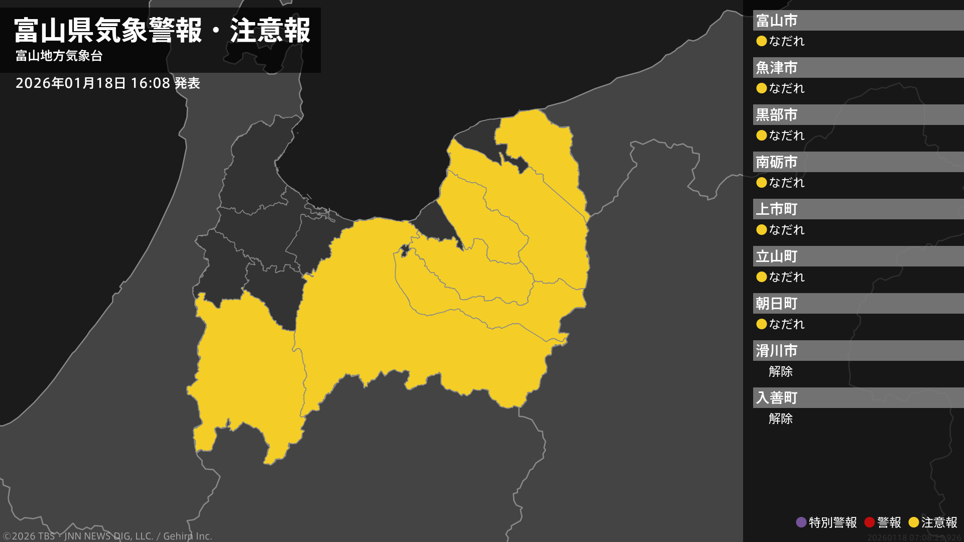 【なだれ注意報】富山県・富山市、魚津市、黒部市、南砺市、上市町、立山町などに発表(雪崩注意報) 18日16:08時点