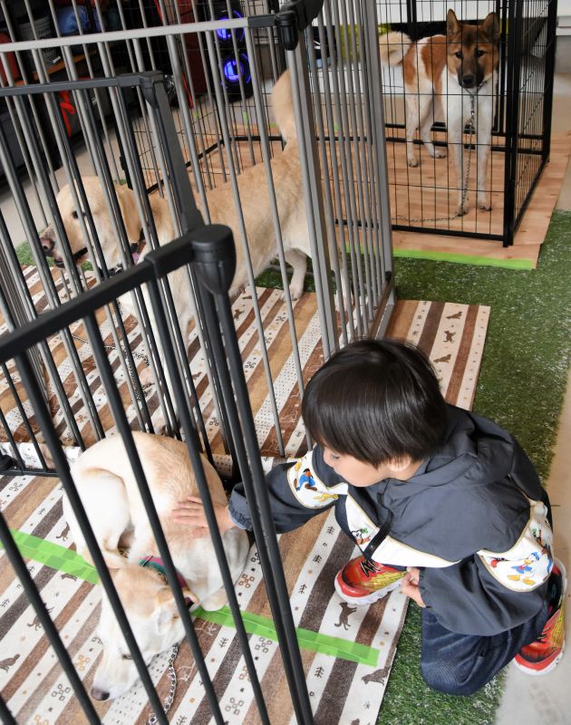 譲渡会で犬と触れ合う子ども