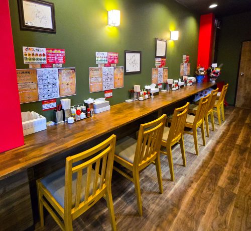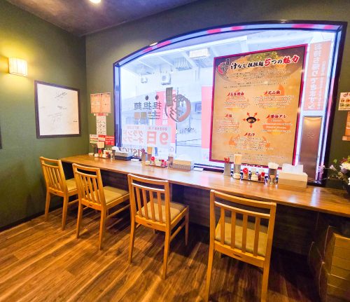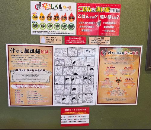 各席の前には、担担麺の食べ方やこだわりが分かるポップが貼られており、初めての方でも安心して楽しめます。