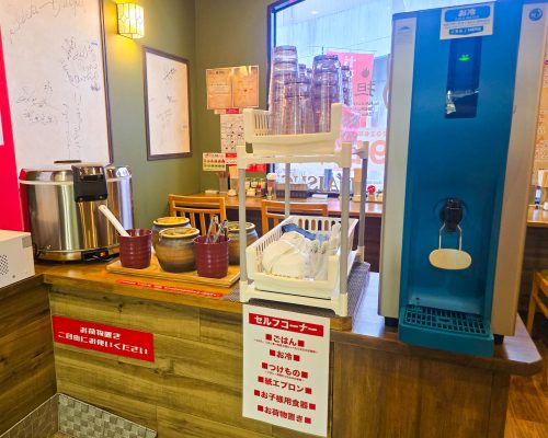 入口近くにはセルフコーナーが設けられており、ごはんやお冷、つけもののほか、紙エプロンやお子様用の食器、荷物置き場などが用意されています。