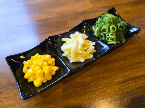 トッピングで選んだコーン、チーズ、ネギを器に入れ、