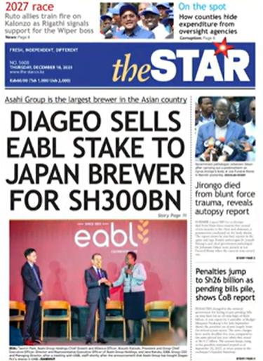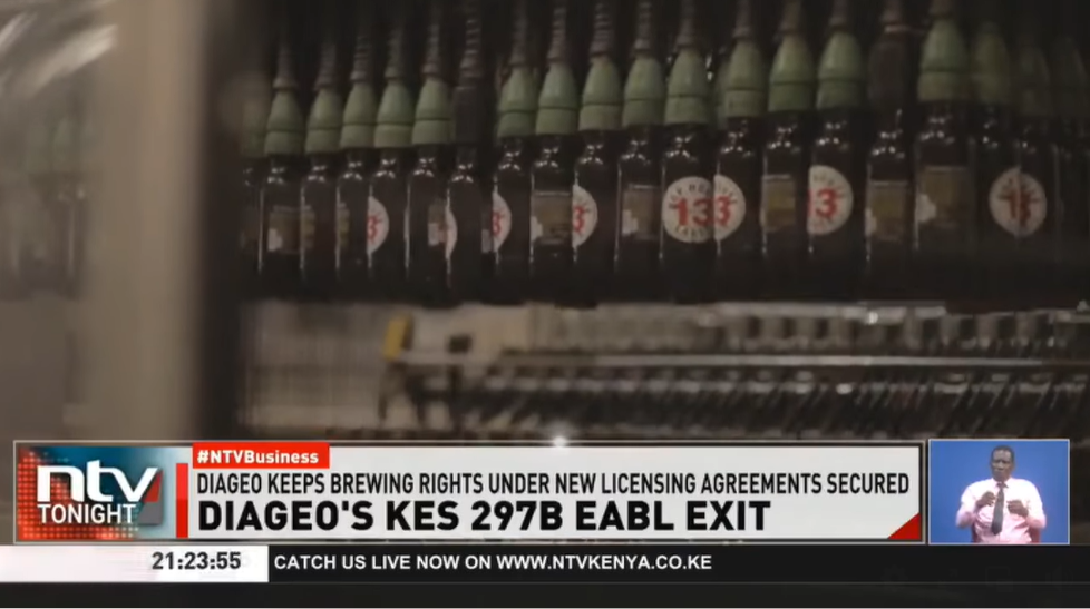 アサヒGHDによるディアジオ保有株取得を伝えるケニアのニュース番組や新聞。「ディアジオの撤退」という文脈で報じるものが多かった