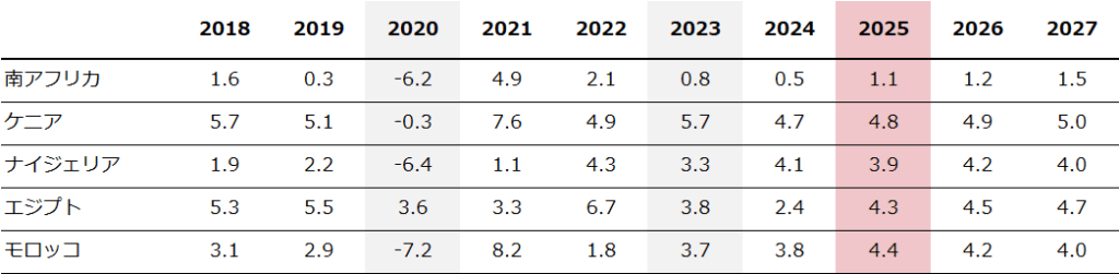 BIG5といわれるケニア、南アフリカ、ナイジェリア、エジプト、モロッコをとりあげ、2025年までの停滞と2025年後半に見られた回復の兆しについて説明する。